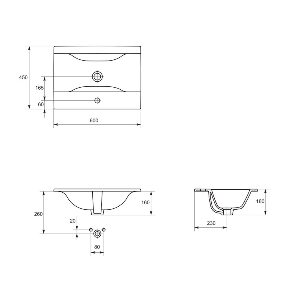 Nábytkové umyvadlo ONTARIO NEW 60 s přepadem a otvorem na armaturu. Umyvadlo lze montovat na desku nebo k nábytku COLOUR, MELAR, MESTA, SMART, STILLO.